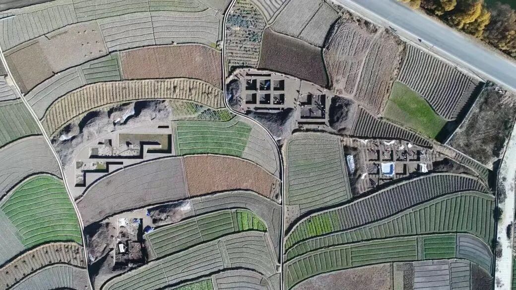 剑川县海门口遗址航拍,遗址核心区从图中丁字路口周围展开