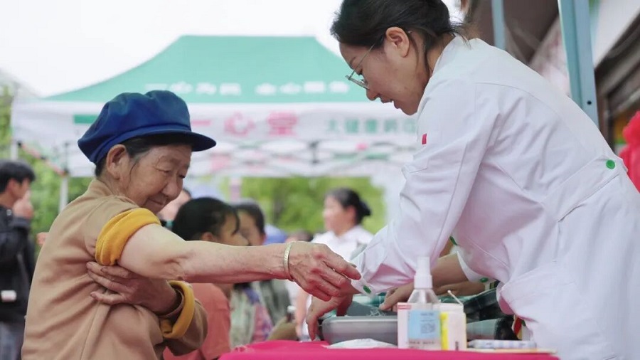 一心堂药师为群众进行健康检测(8月26日摄)。