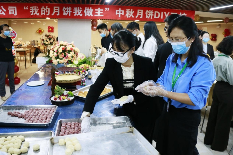 职工们在制作中秋专属月饼(9月28日摄)。吴雄 摄