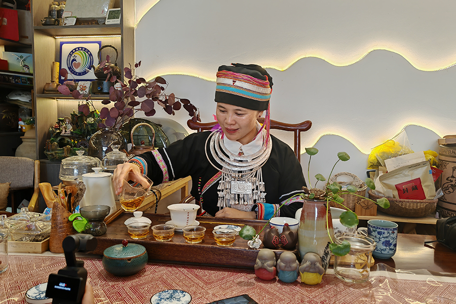 获奖后的小店更热闹了,为了方便顾客品茶,李云丽在铺子角落打造出“品茶区”。后来,麻栗坡县烟草专卖局开展“寻访卧虎藏龙零售户”专题直播活动,还邀请李云丽作为直播嘉宾。镜头前,她一边翻炒新采的茶叶,一边细说掌握制茶火候的诀窍。这场直播不仅让更多人知道了她的店铺,更让传统制茶手艺以鲜活的姿态走进大众的视野。