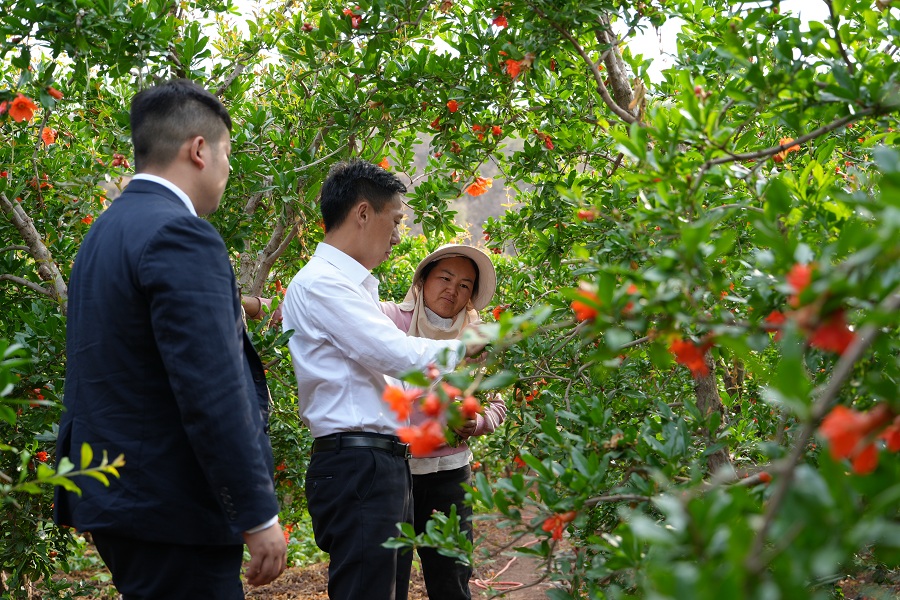 金融机构工作人员了解种植户石榴长势(4月28日摄)。
