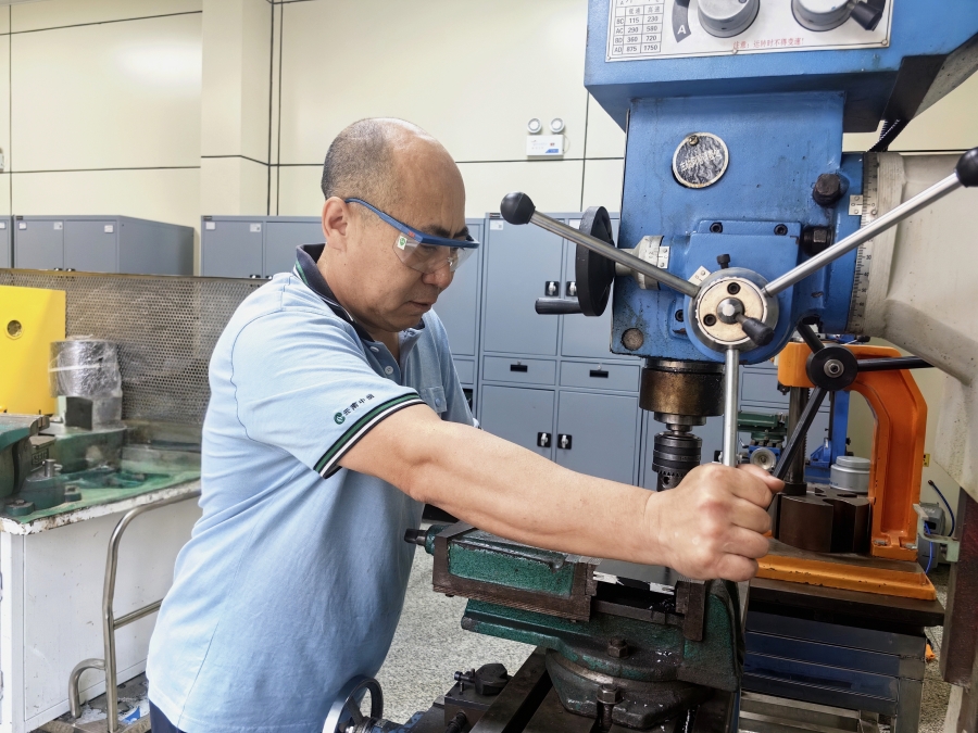 在车间里,热心又爱琢磨的齐红伟还有许多“身份”。水房饮水机的排水管与下水口尺寸不匹配导致地面积水时,齐红伟化身水管工,用废弃零件固定水管,彻底解决问题;除尘间的楼梯因防滑纹路无法粘贴安全标识,他便转为钳工裁剪铁皮,将安全标识牢固地安装在楼梯间隔处;新更换的电机未配备防护罩,他又转为焊工,加工制作防护罩,保障了作业安全。