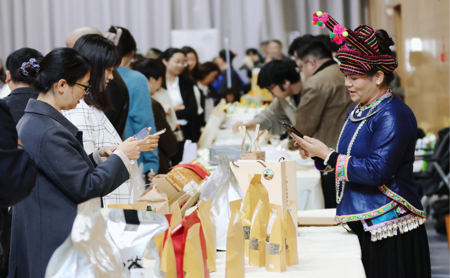 参会者就活动现场展示的农产品进行交流(11月14日摄)