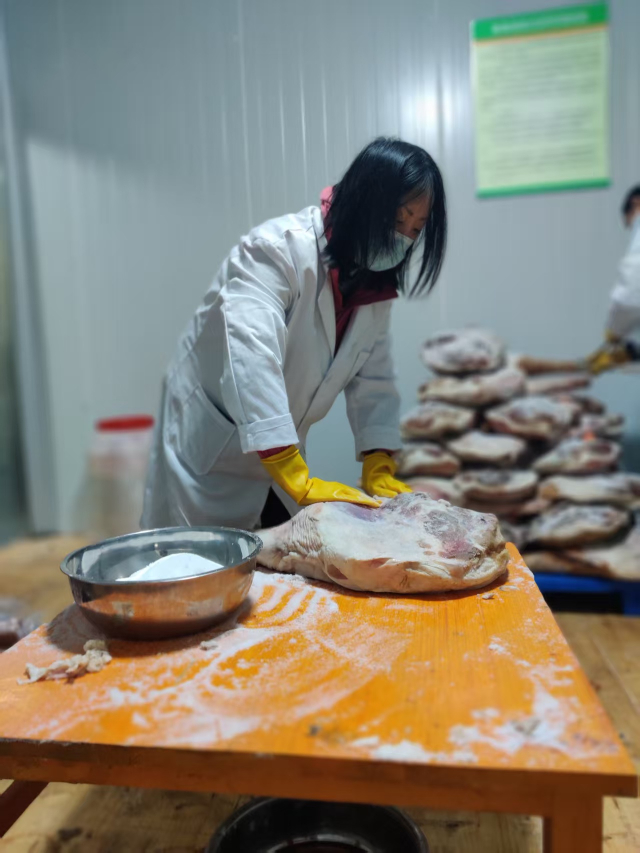 史巧在企业进行火腿腌制实验(2024年3月14日摄)。