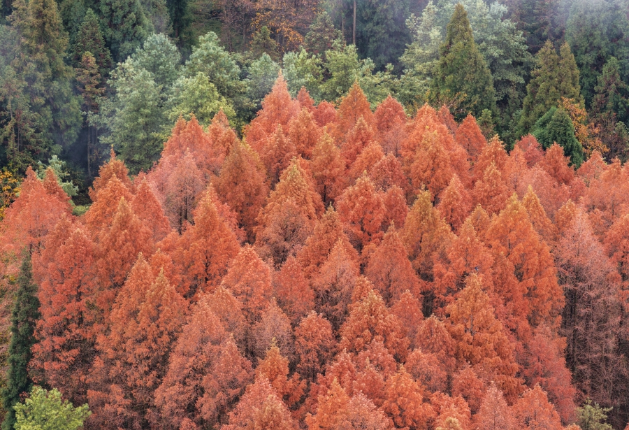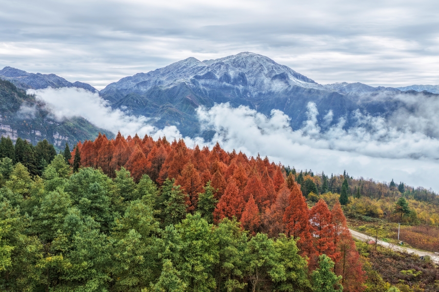 初冬时节,云南省昭通市大关县翠坪山薄雾如纱轻绕,水杉林如绒毯铺展。松柏苍翠,与如火的水杉红绿交织,宛如一幅绚丽画卷。(完)(唐应平)