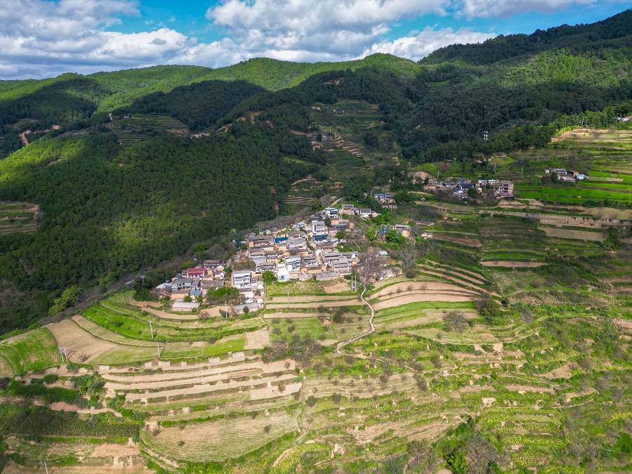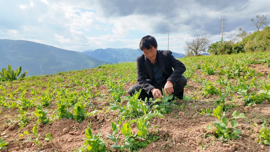 群山环抱中的云南省大理白族自治州弥渡县牛街彝族乡大窝潭村,层层土地沿着山势蜿蜒而下。烟农鲁加保正站在田垄间,仔细查看烟后作物水晶豌豆的长势,翠绿的豆苗在朝阳下焕发着勃勃生机,与远处刚出土的大麦嫩芽相映成趣。