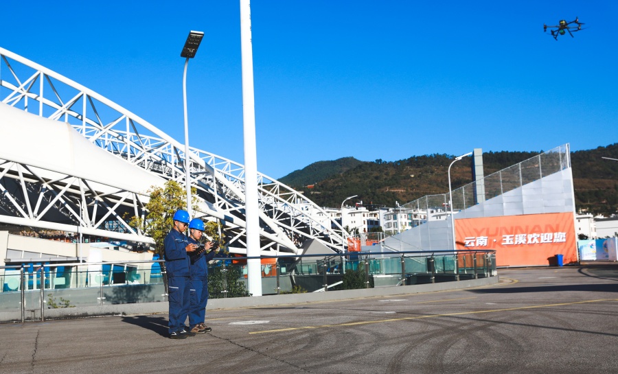 玉溪供电局构建“固定+移动”机巢相结合、多专业联动的“网格化+自适应”巡视模式,对赛场进行无人机巡视(11月28日摄)。代薇 摄
