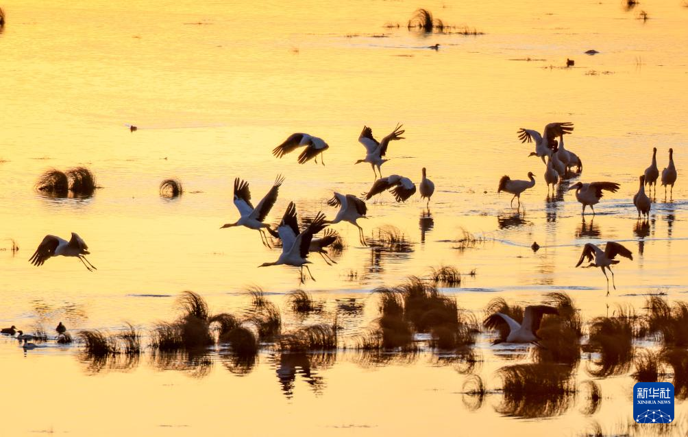 11月30日,黑颈鹤在大山包黑颈鹤国家级自然保护区内的大海子湿地飞舞。新华社发 (范晖 摄)