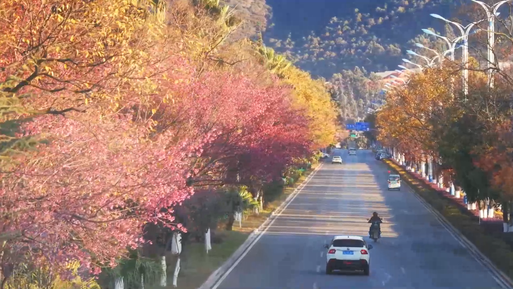 仲冬时节,昆明市晋宁区的山野、公园和道路两旁,冬樱花相继绽放。
