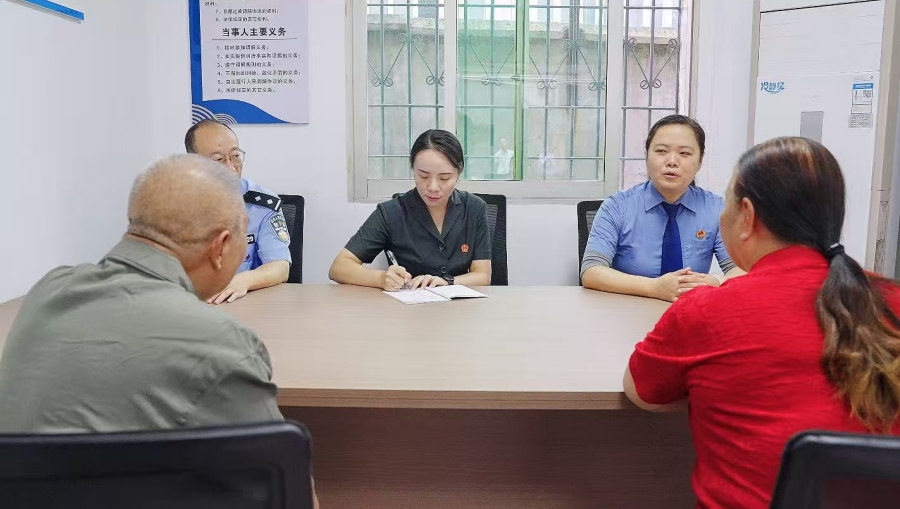 水富市综治中心公检法部门联合调解矛盾(2025年6月22日摄)。
