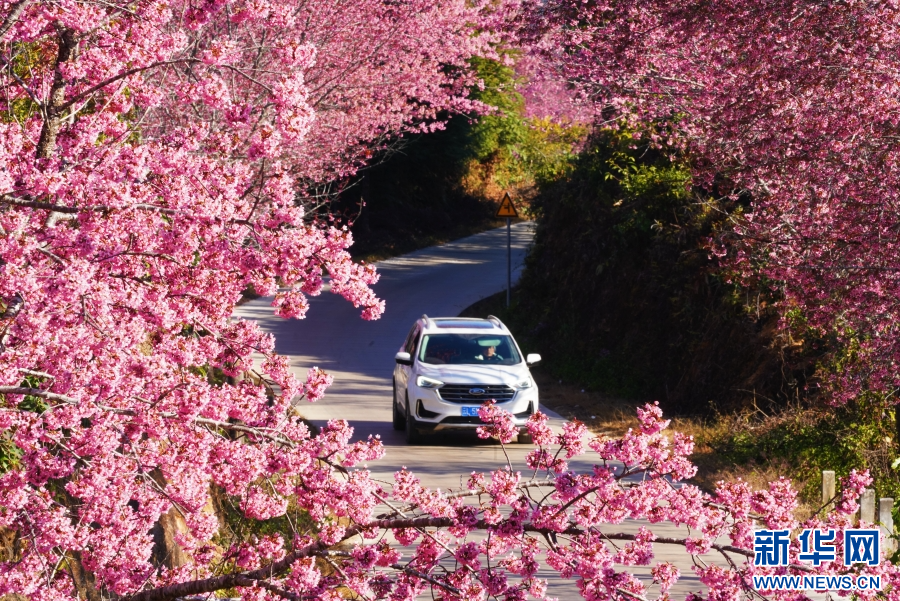 汽车驶过樱花园(2025年12月31日摄)。新华网发(刘子安 摄)