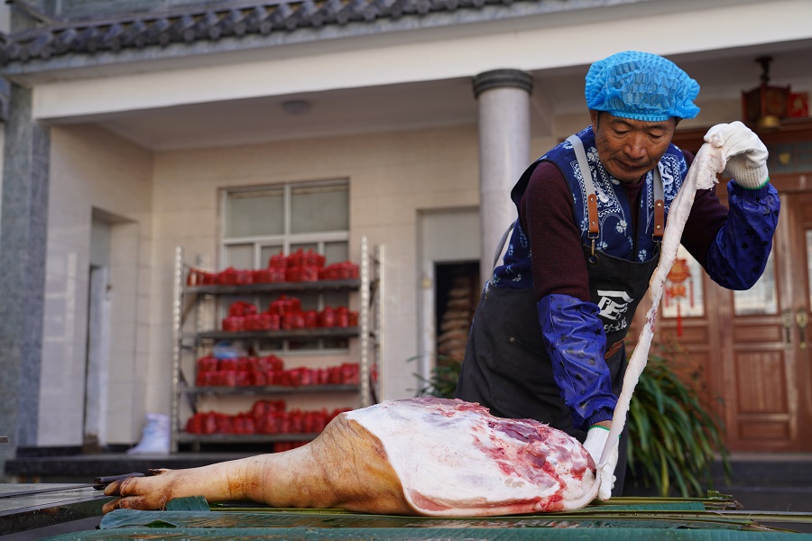 春节将至,腊味飘香,云南省怒江傈僳族自治州泸水市老窝火腿迎来产销旺季。走进老窝镇荣华村“匠珍火腿”作坊,非物质文化遗产代表性项目老窝火腿腌制技艺代表性传承人杨李忠正忙着给火腿上盐揉制,浓郁醇厚的咸香扑鼻而来,作坊里一派忙碌景象。