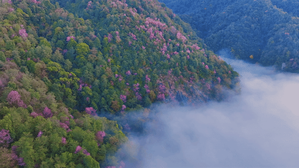 近日,在云南省腾冲市曲石镇青岩子,高山峡谷间大片野生冬樱花进入一年一度的盛花期。成百上千株野生冬樱花绽放,粉色的花朵装点在绿意之上,构成一幅唯美画卷。(完)(屈晓丽 刘正凡 张世东)