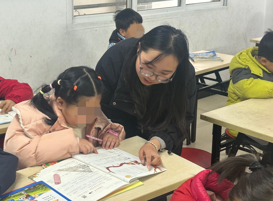 老师辅导孩子做作业(1月20日摄)。