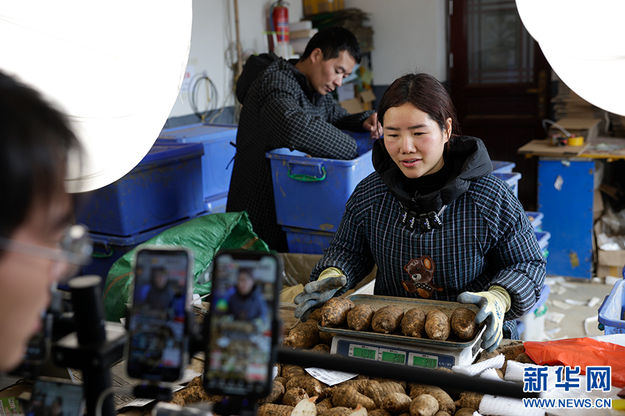 直播间里,主播在介绍小草坝天麻(2025年11月20日摄)。新华网发(徐华陵 摄)