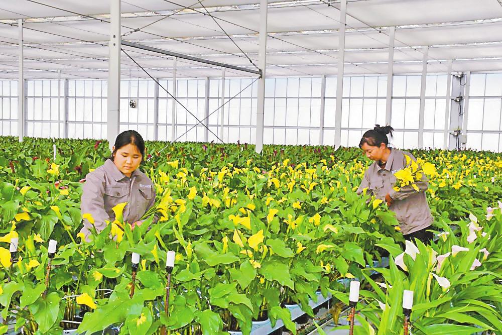 工人在丽江现代花卉产业园内采摘马蹄莲。 本报通讯员 杨四娟 摄