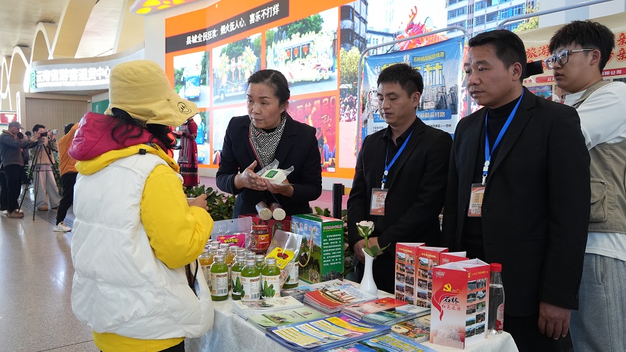 当日,石林县带来的《吉祥欢歌》《疯狂的披毡》等特色文艺表演,吸引众多游客围观。许多游客踊跃参与活动互动,获赠文创冰箱贴、鲜花等。