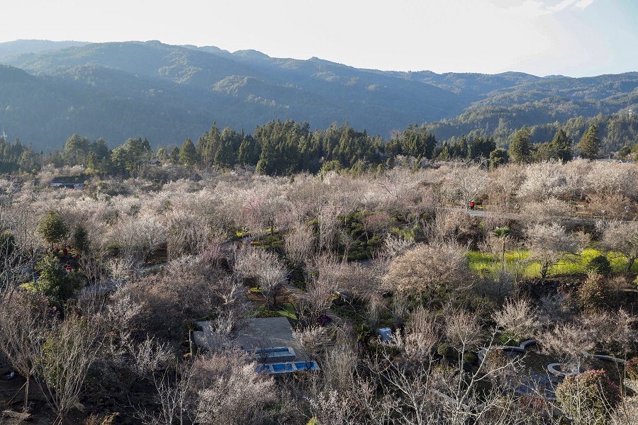 掩映在梅海中的房屋(2月9日摄)。劳海山 摄