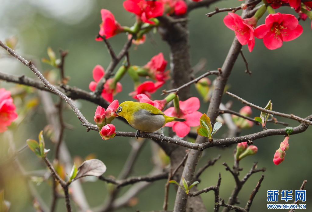 在木瓜花中觅食的小鸟(2月8日摄)。新华网发 郑益 摄