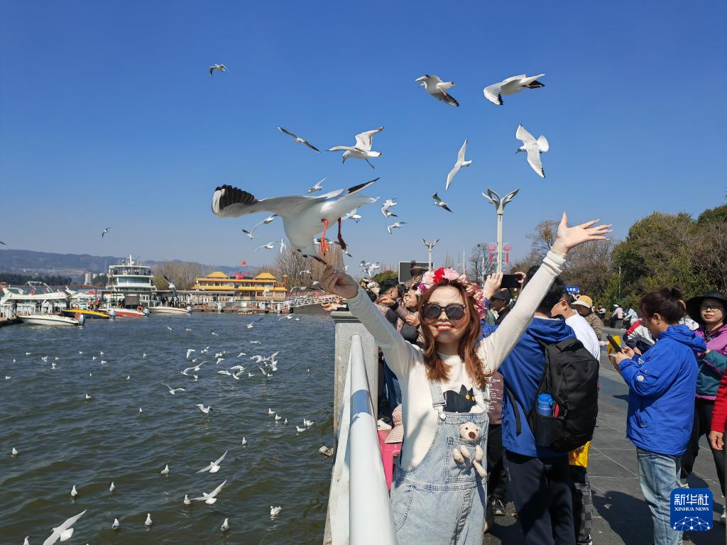 2月16日,游客在云南省昆明市海埂大坝喂食红嘴鸥。新华社记者 浦超 摄