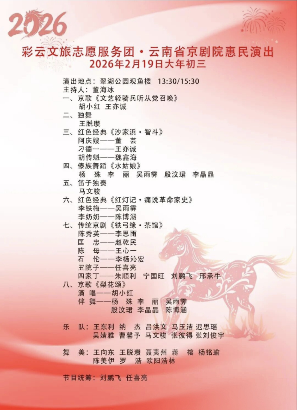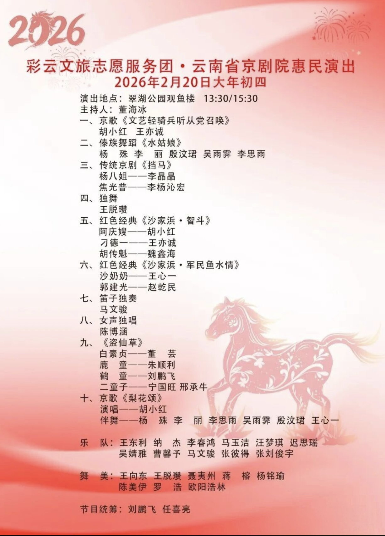 为弘扬中华优秀传统文化,丰富春节期间人民群众文化生活,推进文旅志愿服务与文化传承、民族团结、生态保护等深度融合,根据云南省文化和旅游厅有关工作要求,云南省京剧院将于2026年春节期间在昆明市翠湖公园举行“彩云文旅志愿服务团·云南省京剧院惠民演出活动”。届时,欢迎广大游客朋友们前往翠湖公园观看演出。(完)