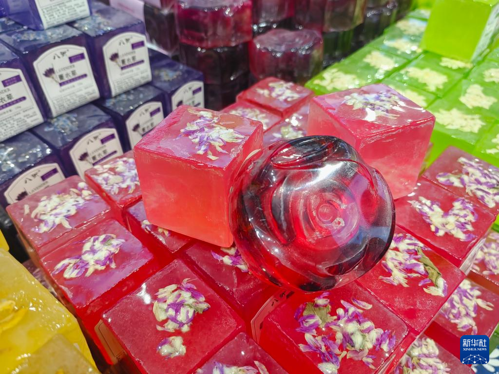 一家鲜花衍生产品店内,正在售卖的鲜花精油皂。新华社记者荆昭延 摄