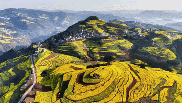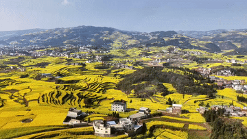 近日,云南省曲靖市罗平县的油菜花进入盛花期,层层叠叠的油菜花田和云海、村舍相映成趣,美不胜收,吸引大量游客前来赏花游玩。