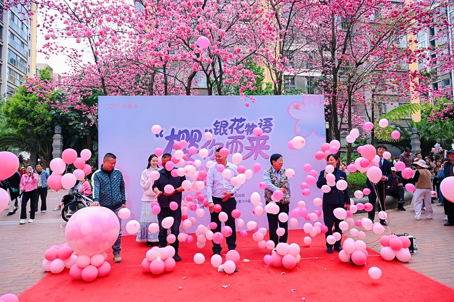 3月8日,2026银海樱花节在昆明银海樱花语、荷塘月色、金江小区同步启幕。本届樱花节以“银花物语·‘樱’你而来”为主题,将春日盛景与社区温情深度融合,为居民打造了一场春日赏樱盛宴。