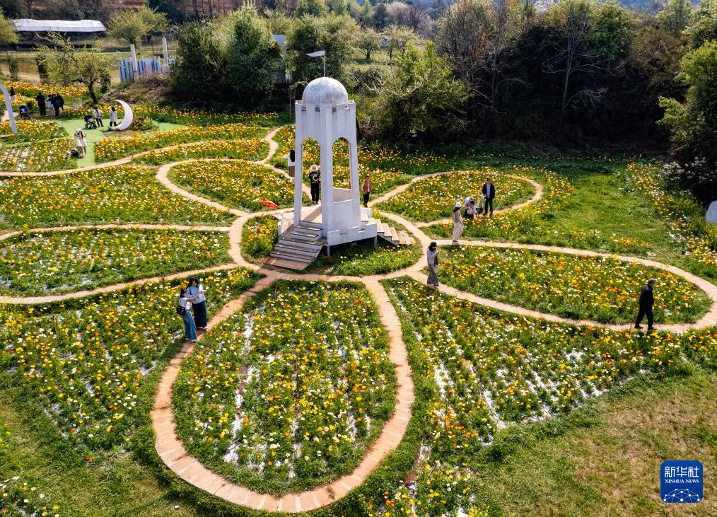 3月10日,游客在昆明名花谷游玩(无人机照片)。新华社记者 陈欣波 摄