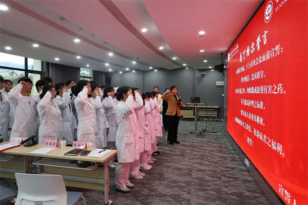 最后,全体学生庄严宣誓南丁格尔誓言。学生代表李千慧表示,将不负学校和医院的培养,以严谨态度投入学习实践,努力成长为优秀的护理工作者。