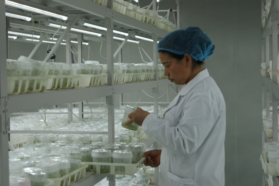 技术人员在接种室内工作(3月23日摄)。
