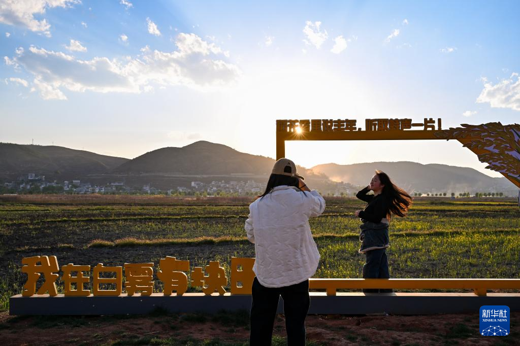 2026年3月24日,游客在白雾村的田野间拍照留影。