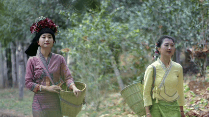 身着布朗族、傣族、哈尼族等民族传统服饰的茶农,穿梭于古茶树间,娴熟地采摘鲜嫩茶青。茶园呈现出一派生机盎然的春茶采收景象。