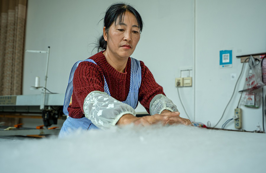 杨彩仙正在制作蚕丝被(3月12日摄)。