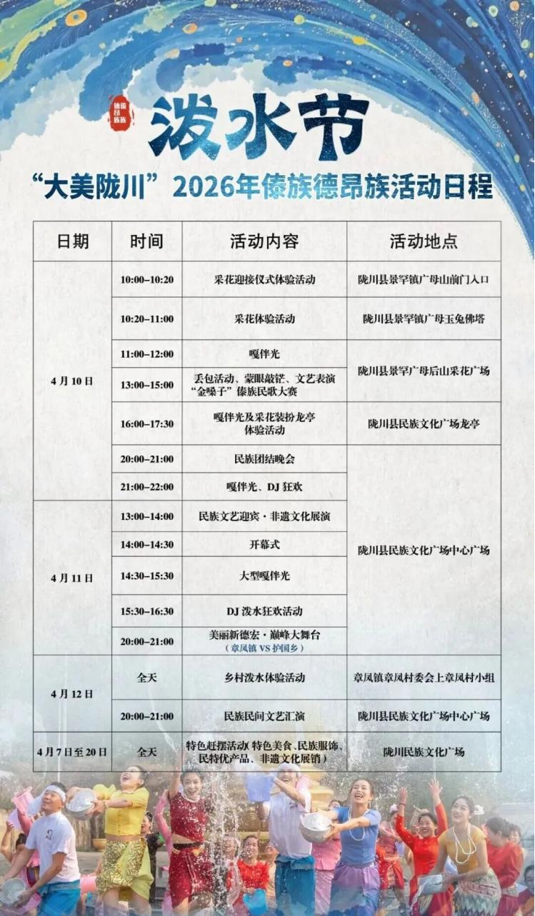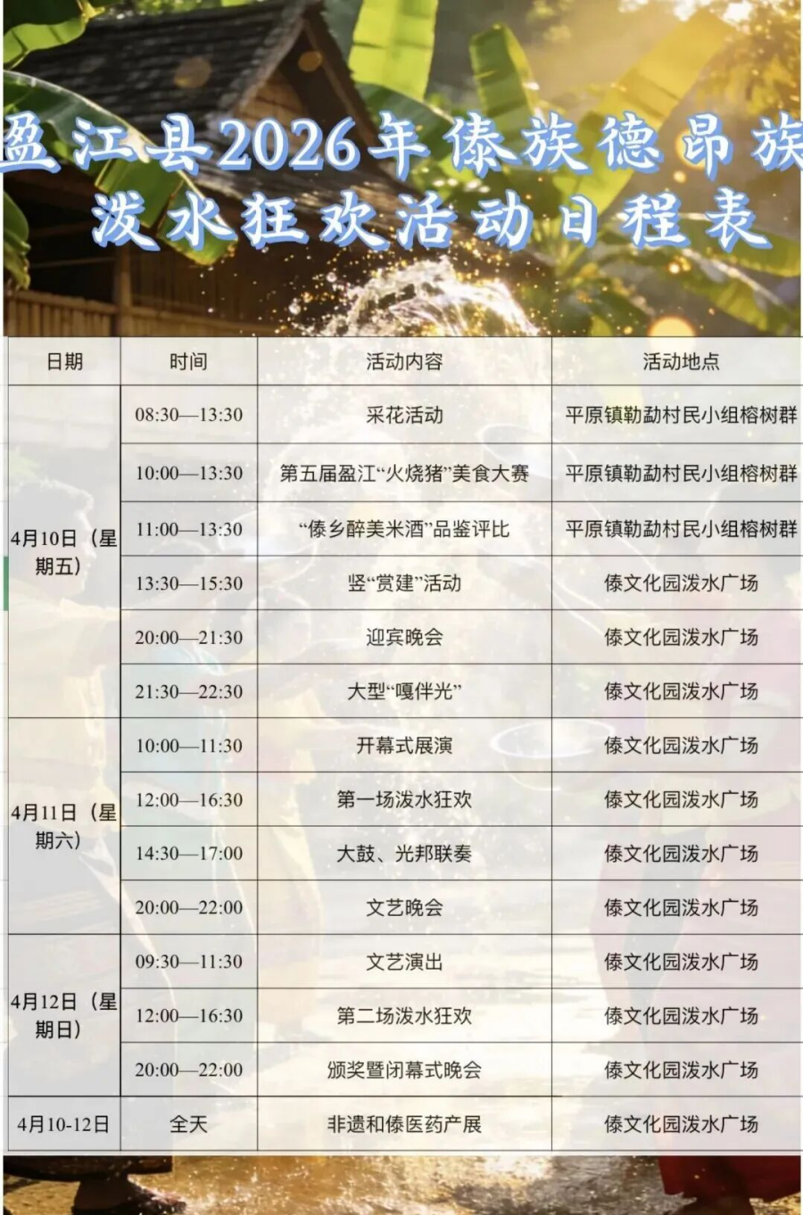 活动内容:2026年泼水节赶摆活动暨“宾弄赛嗨”联欢晚会、放火花、歌舞展演、高升颁奖仪式。