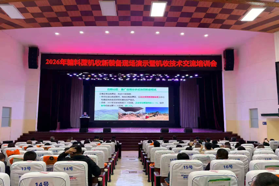 2026年糖料蔗机收新装备现场演示暨机收技术交流培训会现场(3月23日摄)。艾静 摄