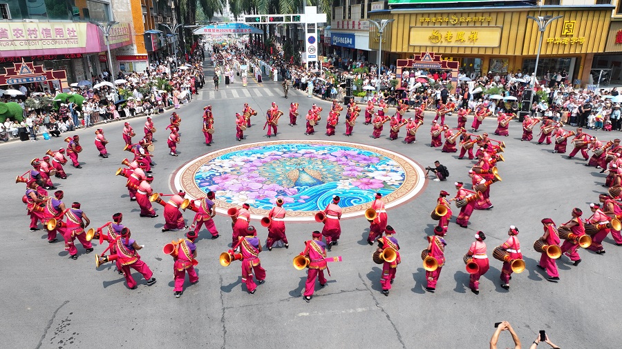 4月15日,云南省普洱市景谷傣族彝族自治县以“千景之谷·花朝水悦”为主题的采花泼水节万人赶摆游演活动,让县城沉浸在一片欢乐的海洋之中。活动通过13个游演方阵,集中展现了景谷多元民族文化交融的独特魅力。(完)