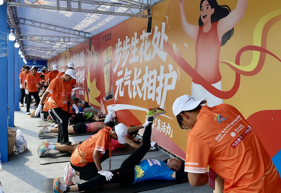 同时,各站点均安排专业医护人员与保障人员全程值守,为选手提供及时、高效的肌肉舒缓与应急康复支持,全力筑牢赛道安全防线。跑者冲线后,云南白药集团保障团队工作人员及时为其喷涂运动喷雾,帮助跑者快速缓解运动疲劳与肌肉酸胀,高效恢复身体状态,推动构建覆盖全赛程的健康防护体系。