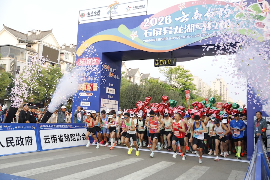 4月19日,2026云南白药石屏异龙湖马拉松在云南省红河哈尼族彝族自治州石屏县举办,6000余名来自全国各地的跑者齐聚异龙湖畔。当日7时30分与7时45分,随着发令枪先后响起,全程马拉松与半程马拉松选手迎着朝阳开跑。