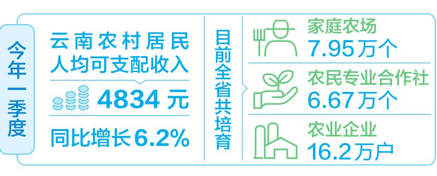 一季度云南农村居民人均可支配收入增长6.2%,正是这样一个个典型聚沙成塔的结果。日益壮大的新型农业经营主体,不仅成为描绘云岭丰收图景最有力的画笔,更有效带动农民增收致富。