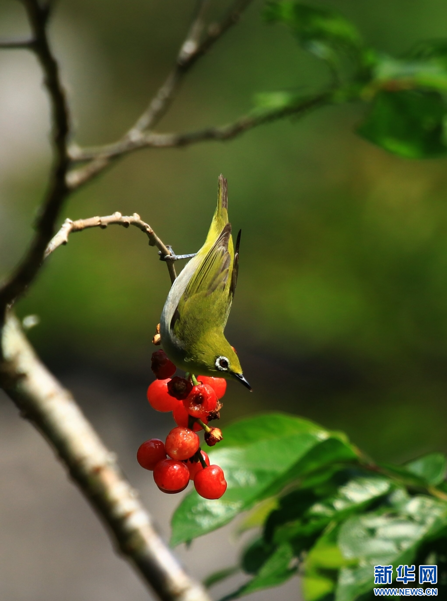 云南省腾冲市和顺镇,绣眼鸟啄食樱桃(4月19日摄)。新华网发(赵辉 摄)