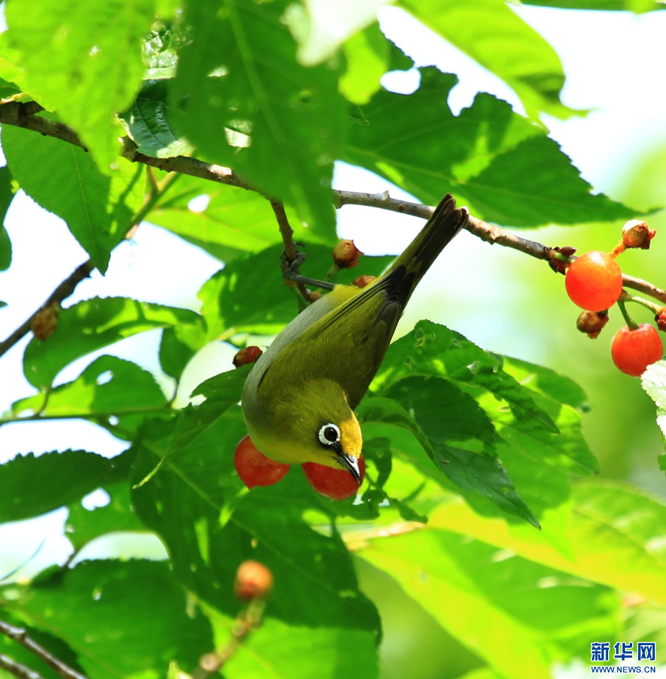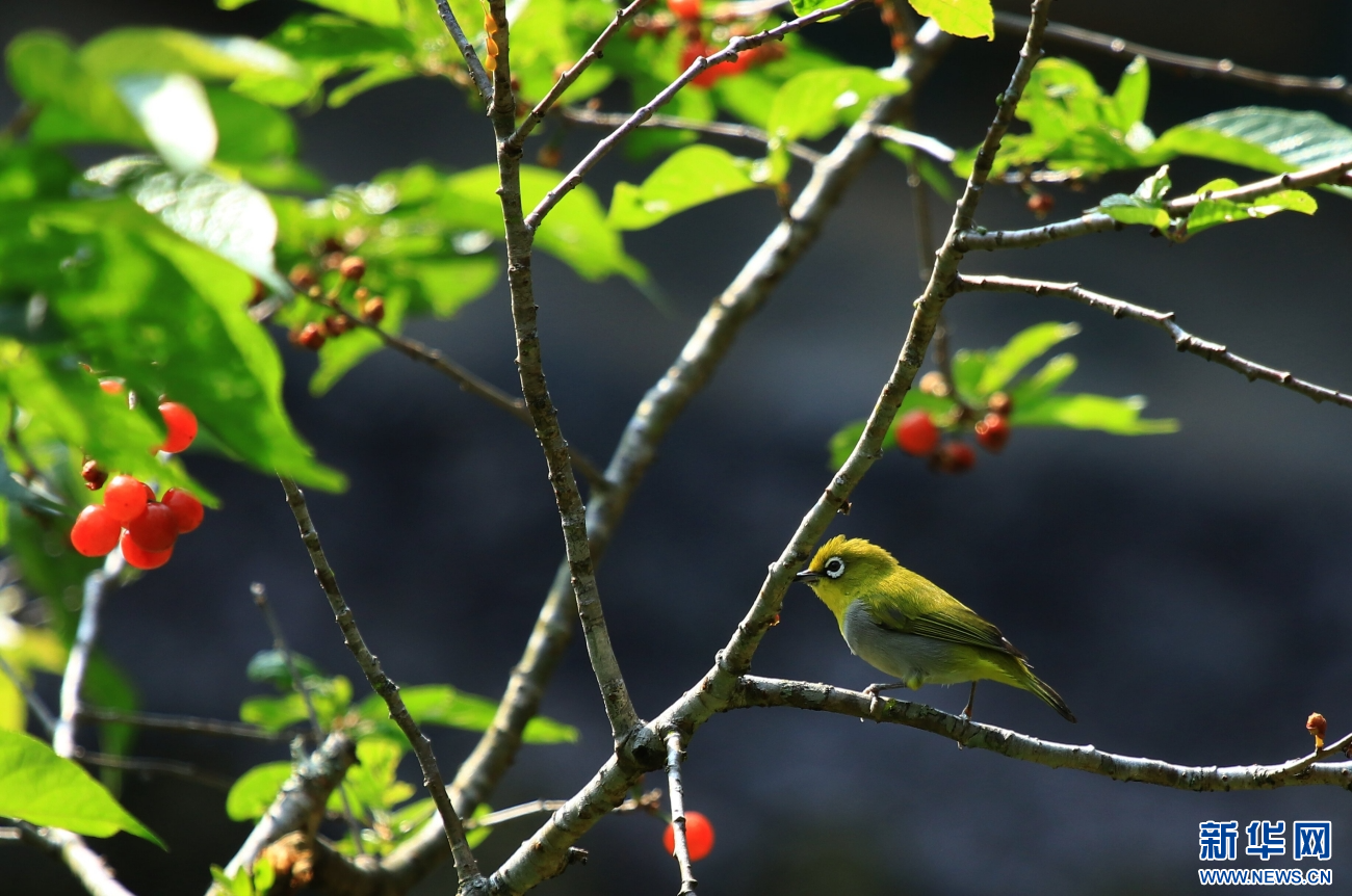云南省腾冲市和顺镇,绣眼鸟在樱桃树枝头停歇(4月19日摄)。新华网发(赵辉 摄)