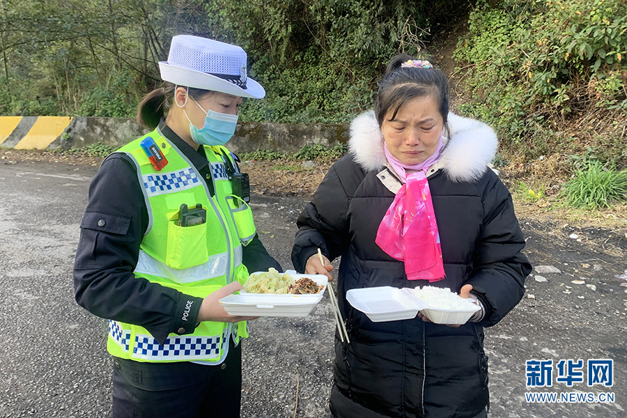交警张彤将饭菜送到高某面前时,高某泣不成声,表达着自己的感恩之情(1月21日摄)。新华网发(保山市公安局交警支队 供图)