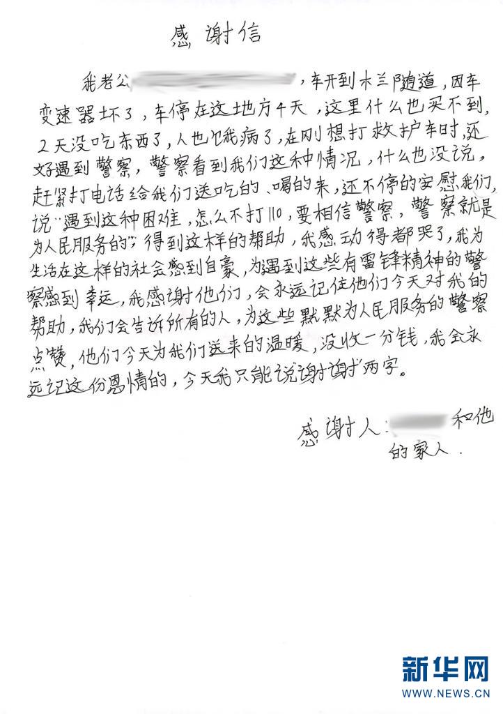 高某写的感谢信(1月21日摄)。新华网发(保山市公安局交警支队 供图)