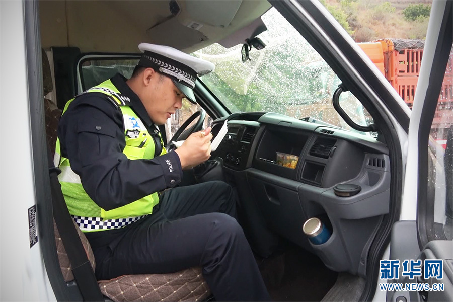 红河哈尼族彝族自治州公安局交警支队元阳高速公路交巡警大队二中队中队长张籍在警车上吃饭,迅速吃完后又再投入工作之中(1月19日摄)。新华网发(红河州公安局交警支队元阳高速公路交巡警大队二中队 供图)