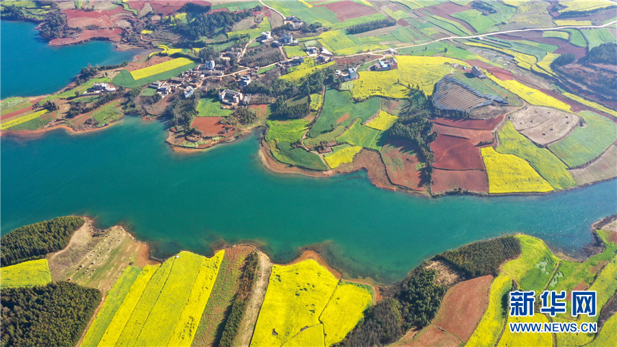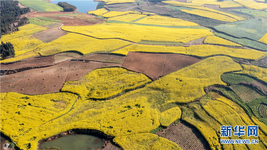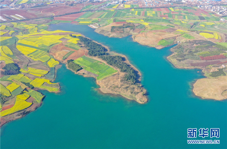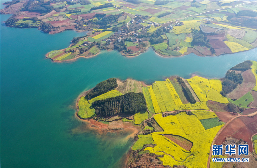 时值仲春,云南省曲靖市师宗县大同街道溜子田水库周边田地里的油菜花开得正旺,清澈碧绿的湖水与金黄色油菜花相映成趣,让人流连忘返。新华网发(孙文来摄影报道)