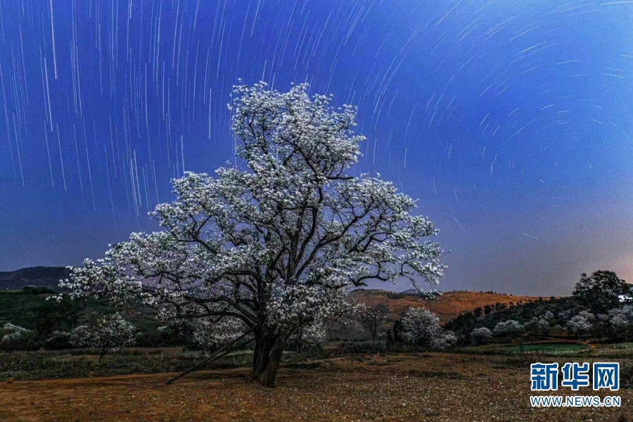 开远浑水塘村盛开的玉荷花与星轨(2021年3月27日摄)。新华网发(王云翔 摄)