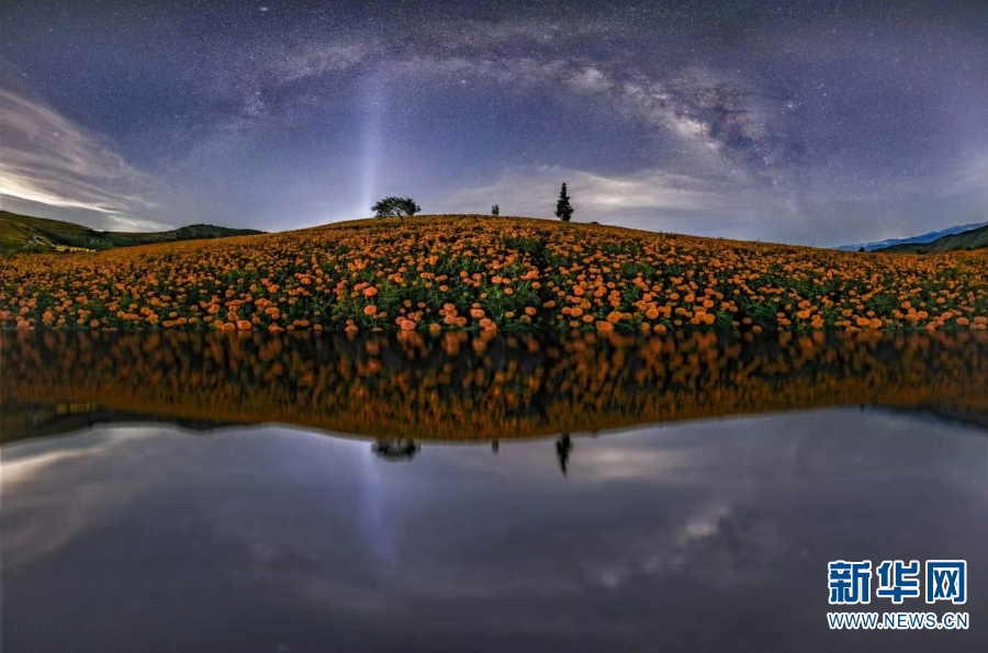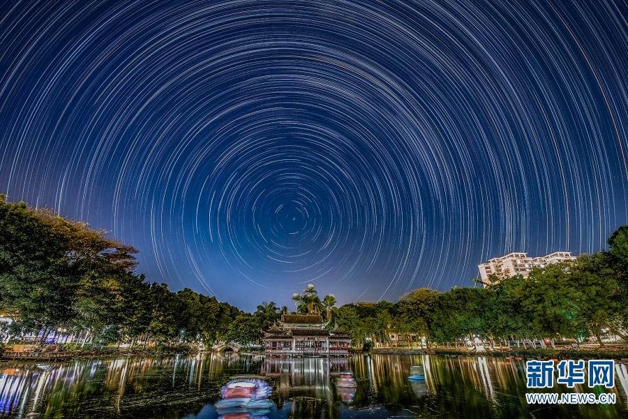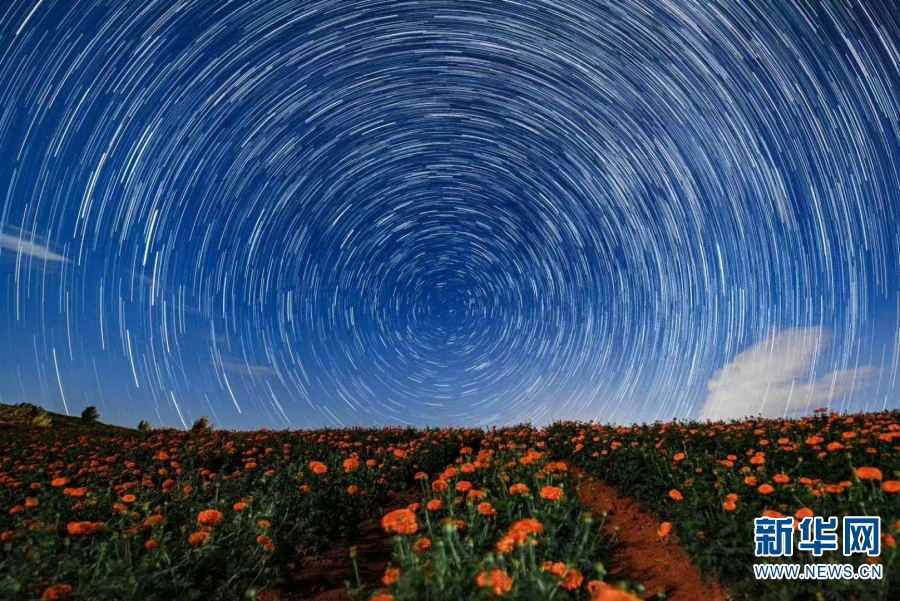 在云南省开远市,摄影师耗时三年拍下璀璨星河。夜幕降临,万寿菊、玉荷花,以及开远地标建筑成为璀璨星空的前景,繁星运动轨迹让人震撼。新华网发(王云翔 李雪琼摄影报道)