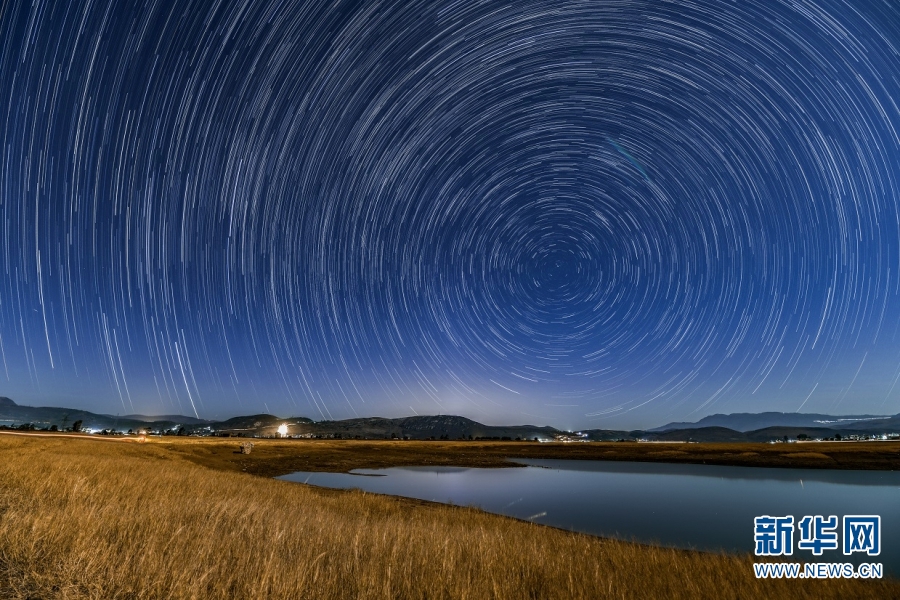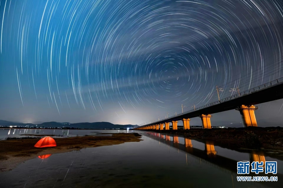 开远三角海水库上空星轨(2020年12月28日摄)。新华网发(王云翔 摄)