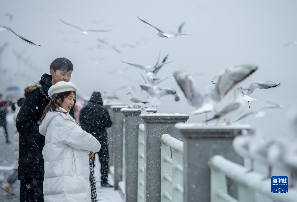 2月22日,市民冒雪在海埂大坝观赏红嘴鸥。当日,春城昆明迎来降雪天气。新华社记者 王冠森 摄 2月22日,小朋友冒雪在海埂大坝投喂红嘴鸥。当日,春城昆明迎来降雪天气。新华社记者 王冠森 摄 2月22日,市民在海埂大坝堆雪人。